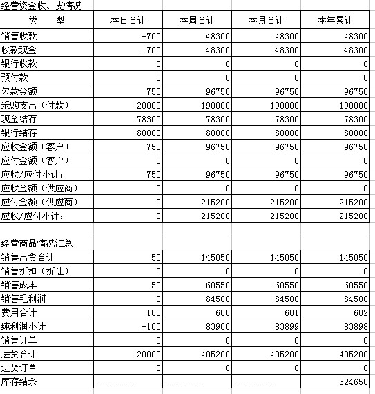 我想提个请求。能不的能按照以下的格式帮忙加一个经理决策的报表(经营综合汇总表)。因为我们的软件好是好。但是在报表方面太笼统了。不够完整。像我们一般的店面不可能像一般公司一样做了进销存后还会再会做会计账(会计分录),这个会计账一般都要请专业的会计去做的。但一般的小公司特别是个体户基本是不会再做会计账了。这样进销存所有的报表就感觉很分散。都抓不到重点了。然后还要分开去计算或者利用EXCEL做汇总统计。无形中又增加了很多工作。所以恳请老师一定要设计一下。将对公司有用的资料信息汇总一下。。。