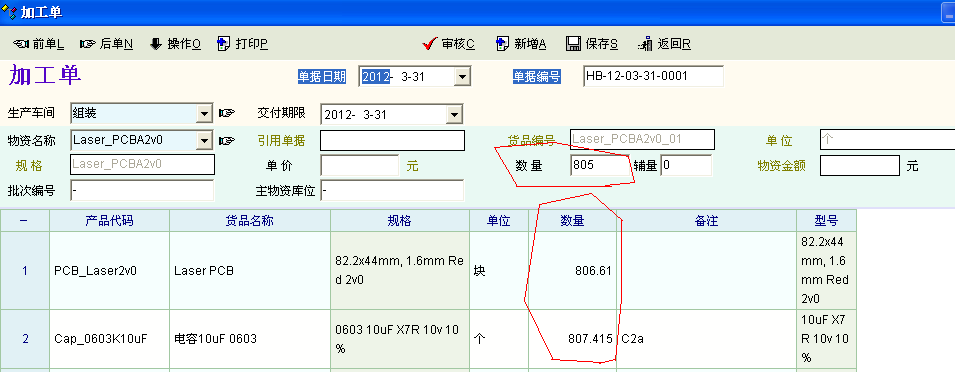 2、当在补货计划单和加工单等单据中调用这个物品时,物品的数量会为小数(不是整数,如图所示)。