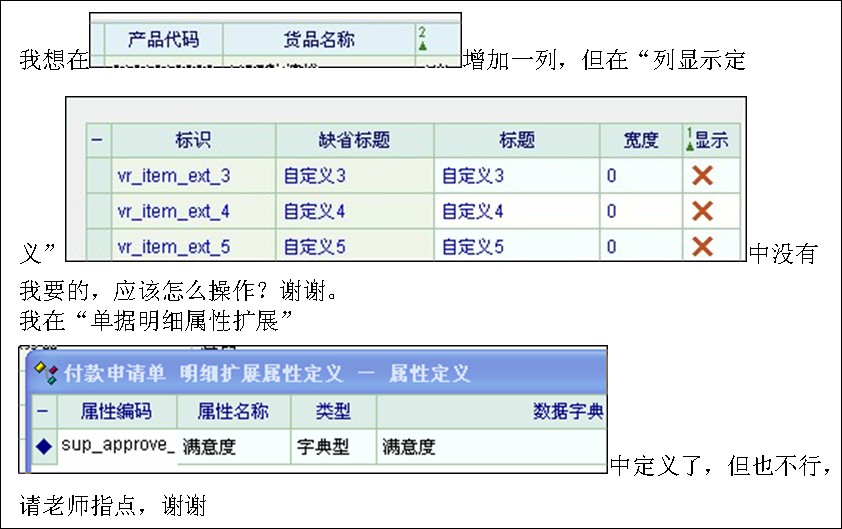 我想在增加一列,但在“列显示定义”中没有我要的,应该怎么操作?(我在“单据明细属性扩展”中定义了,但也不行),请老师指点,谢谢