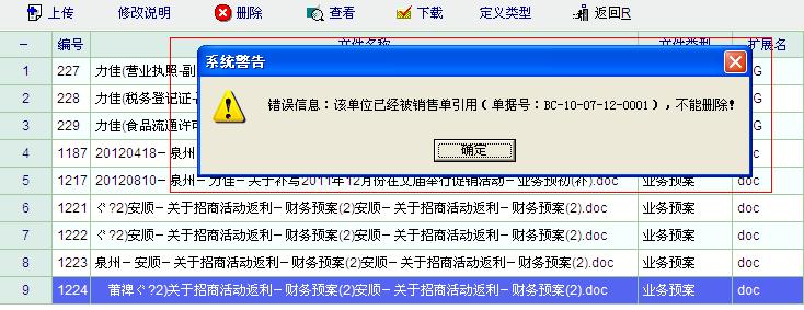4、上传附件应该与单据引用没有关系,但在测试时,欲将测试用的文档删除时,却会提示如图所示--单据被引用而不能删除的问题,但重启后可以得到解决,能顺利删除