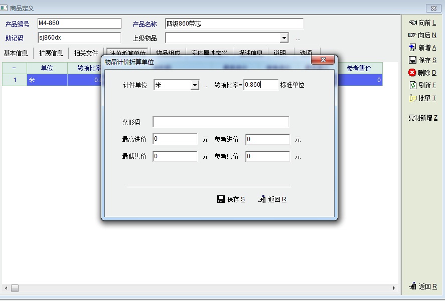 折算单位主要用于产品有多种计量单位。一般应该设置最小的单位为基本单位,较大的单位为折算单位。