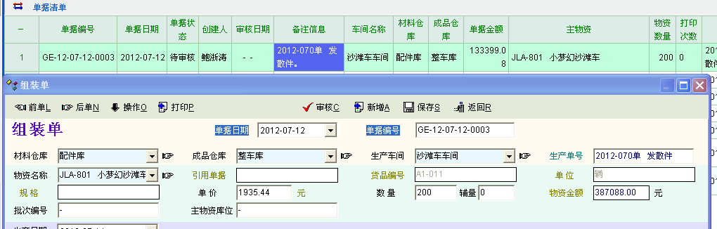 老师:库存管理软件里,同一组装单金额显示不一样。(组装单明细与组装单列表对比)。