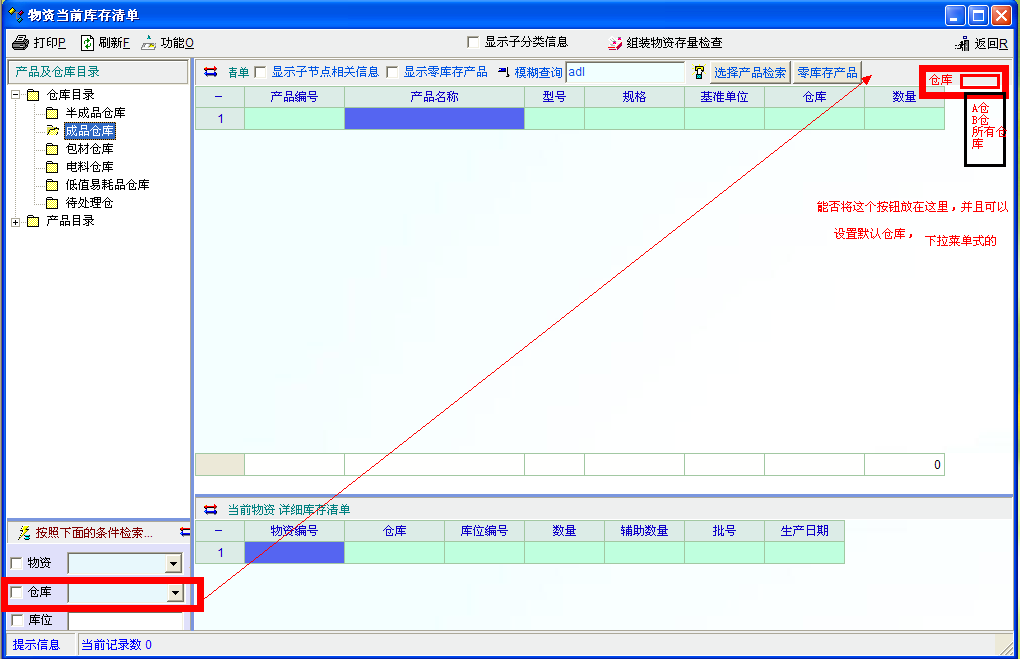 至于搜索。看在哪里搜索了。库存清单 里可选仓库的。