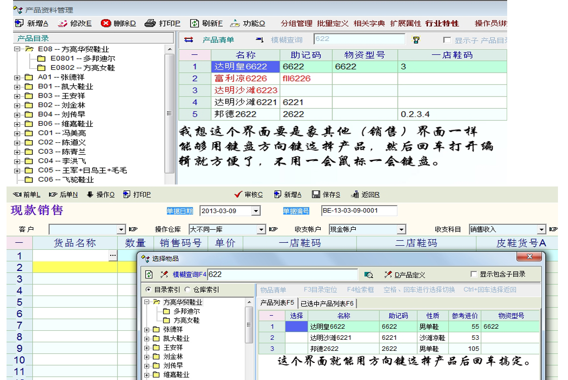 再补充说清楚一点,产品资料查询界面在模糊查询窗口输入助记码回车后,出现下面的一系列产品名称,这时不能直接按方向键选择下面的产品,要用鼠标点击下面出现的产品名称后,才能使用主向键选择。