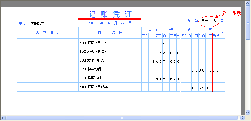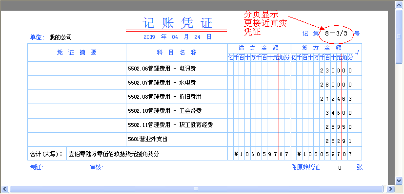 我是在count 于 2012-10-20 20:56发表并三生石上修改后的一个会计凭证的打印模版的基础上进行美化的, 加入的分页的显示,合计处加上了大写金额,看上去此模版更接近真实的会计凭证。 count发表的网址链接:http://www.onlyit.cn/user_show_topic?user_id=26588&topic_id=40420&subject_id=56