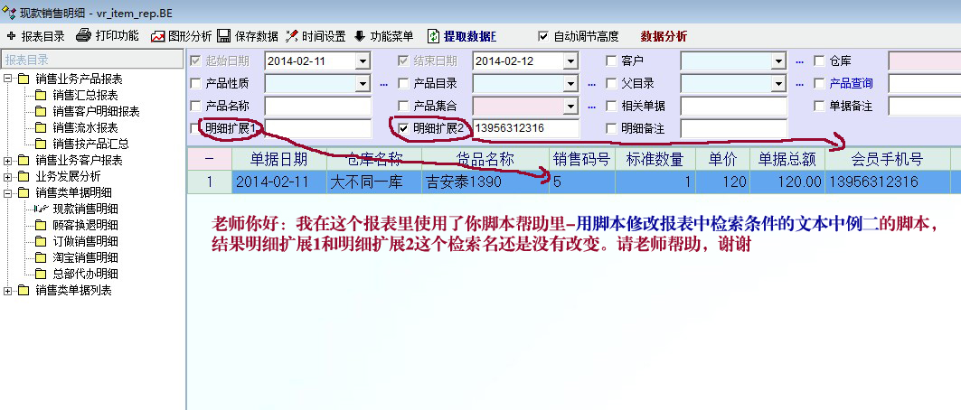老师你好:我在销售明细报表里使用了你脚本帮助里-用脚本修改报表中检索条件的文本中例二的脚本,结果明细扩展1和明细扩展2这个检索名还是没有改变。请老师帮助,谢谢。使用脚本如下: