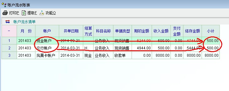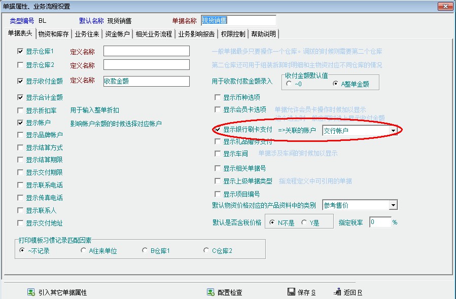 我们在实际【现货销售】结算时。客户所带现金不足,部分金额须要用银行卡支付,我发现在【单据属性,流程设置】中,有【显示银行刷卡支付】选项,并可以【关联相关帐户】。确实方便好很多。能够自动分别记入【现金帐户】和【银行卡帐户】。在【流水帐】中也能很清楚的分列出来。