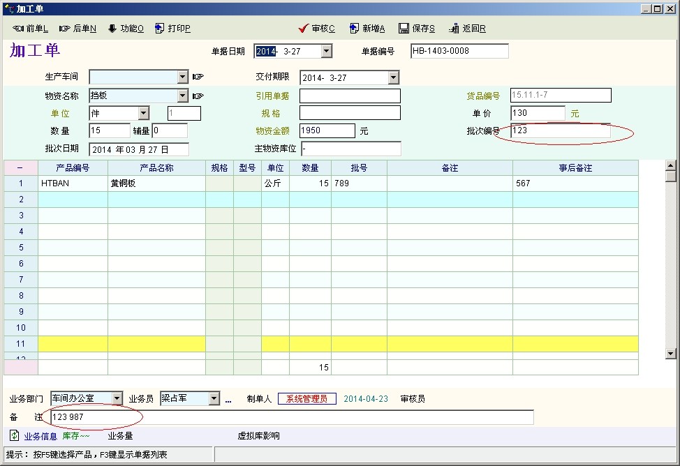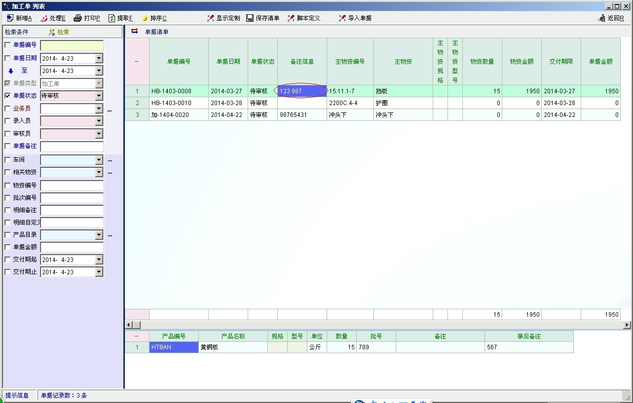 由于单据主物资中的批次号在列表中无法直接查询,在实际工作中造成了不方便,想到单据的备注在列表中可以查询,在单据添加脚本,使单据中添加的批次号自动添加到备注中以方便查找。