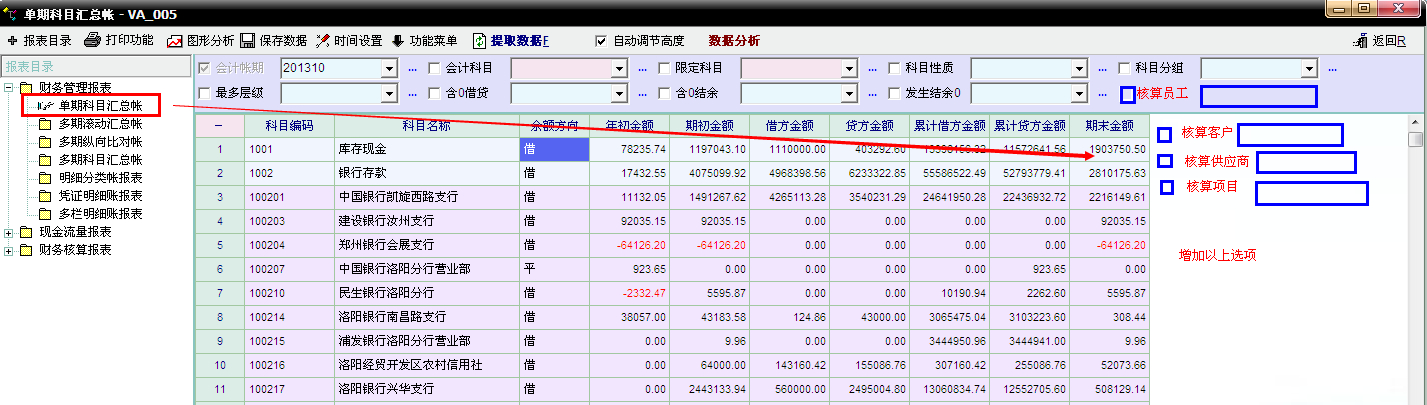 2.在“凭证报表‘里,对于包含辅助核算项目的会计科目同样依核算项目内容依次显示,打印时在会计科目的地方,辅助核算项目以明细科目的格式显示,对于明细账,也增加同汇总账同样的条件选择项,比如是否含0借贷、0结余、0发生结余等。