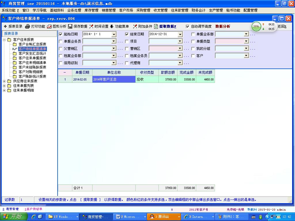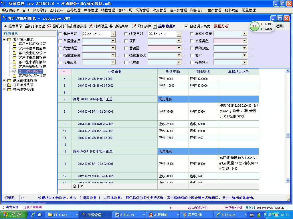 其实个人感觉,没必要这样去整这个报表。这完全是个人或是极少数人才会这样关注应收账款。 真的的应收账款,就是像财务一样流水账一样,以总额去收的。 一个客户。从01年开始做生意,开始有应收单据,产生应收款。。。 然后到了02年,本来客户的应收账款,是接着01年的开始为初始额,再接着业务,欠款,收款,应收总额。 那么 到了03年初的时候,老板想问,财务啊,我XX客户,01年欠的款,你02年收了多少。(或者说02年你收了多少01年XX客户欠的款,收了多少02年他直接欠的货款,他现在共计欠我多少钱)。。。。 要注意,这个问题侧重点是,把02年收款,分清楚,有多少是01年单据欠的款,有多少是02年交易产生的应收款。 那么真到了04年的时候,01年的款还有未结清的呢?还从01一直整到03年尾?那到16年呢?如果客户还有01年欠的款呢?所以我个人的想法就是,这个报表是不合理的,不用去整这个报表。而且这里面也没有什么规律。 如果作为申请需要这样的报表,首先,你得找出这个业务的规律出来,解决的思路是什么,怎么去统计它。起码地提供了这些业务上的一些规律。 那么 首先待结单据的意义 ,就是查某段时间内,客户产生的单据有没有结清的。 其次呢,查询客户到现在为止,欠了多少款。这还不够吗? 非得整个报表解决来解决: 老板想问,财务啊,我XX客户,01年欠的款,你02年收了多少。(或者说02年你收了多少01年XX客户欠的款,收了多少02年他直接欠的货款。) 要知道,软件是以客户产生应收款单据为基础,去汇总客户应收共计欠多少,付了多少,还有多少没有结清。而不是以某个时间点结清账款,以这个时间点创建另一段初始的应收数据。 上面可以先后顺序有点混乱, 1、本人觉得没必要整这个报表,是因为觉得这个报表没有合理性,逻辑性,可实现性,或者说我理解得不够深,水平还不够。 2、要避免一些非必要需要,老板随意想要的报表,利用软件中现有的报表去反应现实情况。 楼主截个自己整的EXCEL表格来反应某个客户5年来应收账款,自己这个报表想要反应的格式看看。 |