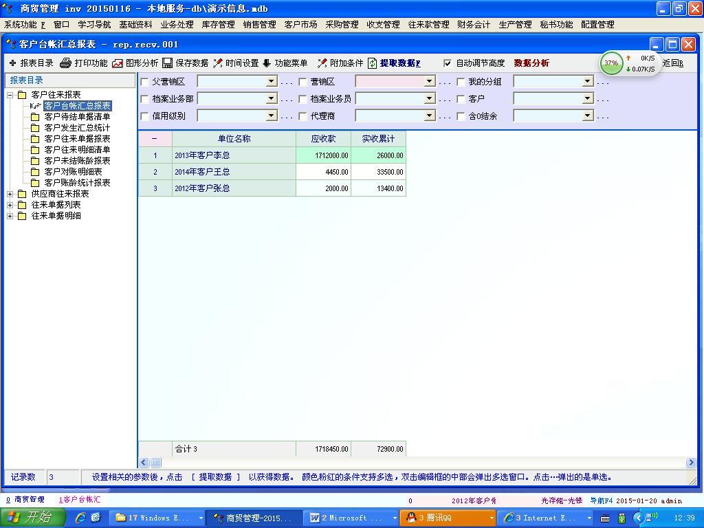 这个报表如果说没有意义不全面。很多销售公司,是按销售员收到款的金额来提成的。如张三,2012年在公司任职,那么他产生了100万的销售应收款,他自己当年只收到80万,还有20万没收到,就意味着的他余下的20万会在以后的一二年内收。下一年收到多少,他就提成收到款的多少。如果销售员多了,这种销售提成的数据就很复杂。如果用电子表格去做当然能成,那就没有自动化办公的意义了。你们考虑的是财务的延续性,当然不要就做这种结算,当做财务人员,他们可是要去算这种数量的。 我附上了为此事,专门做了一个演示库,夏老师也用这库操作了,发现问题确实存在。 |