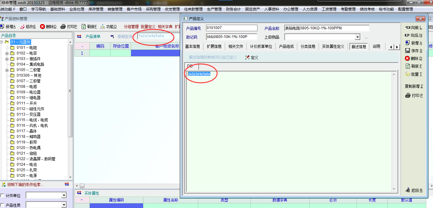 如图所示 产品定义----描述信息中的内容无法在产品资料中检索出来 希望老师增加此功能,可以方便把特殊信息检索出来 另外对应此功能在各类单据中单据明细列表定义中增加产品描述信息相关列,并将相关描述信息名称做成下拉式列表形式,选取后会在当前列后显示相应描述信息的内容 语言组织能力有限,希望老师能理解 谢谢