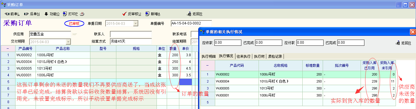 请教一个问题,设置单据引用流程定义:上级单据 采购订单 下级单据库存管理 入库单 ,因为有的供应商送货时没完全按数量或点错送货少1.2个是正常的事,这样我们就算这订单已经完成了,所以入库单 就没有引用完采购订单的数量,未引用剩余1.2个,这张单系统就没有自动设置完成标志,操作员手动设置单据完成标示后,在做入库单时,选择相关单据还会显示出这张订单来,有比较多这样的订单,容易造成混乱,如何设置这样手动设置单据完成标示后的订单也不再显示在相关单据引用里呢? 在下级单据选择相关单据(F6) --单据引用界面里选择对应的订单 点右键--设置引用完成标示,新增的时候就不引用,这样是可行的,但是有的情况是一个上级单据对多种下级单据,多种下级单据都要在引用界面里选择对应的上级单据 点右键--设置引用完成标示 这样的操作也有点麻烦了,能否只有在源头设置完成标示,下级单据都不再引用? |