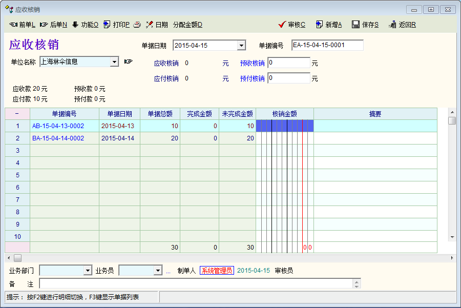 你看你第一张图片 应收 20 应付10 可以冲抵,两行各写10就行了 。你显示定制把类型显示出来看的更明白。