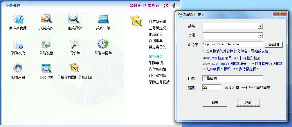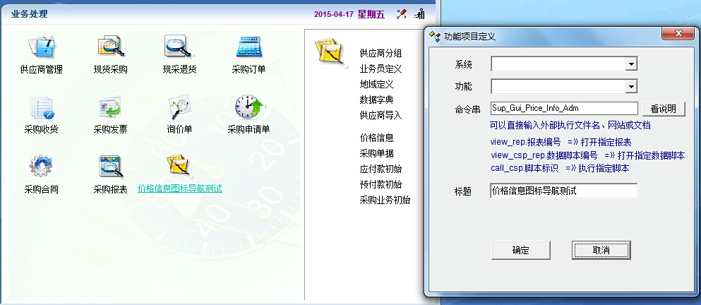 在采购管理的标签导航中的价格信息,我想把它制作显示到图标导航中,操作后功能无反映。有命令串Sup_Gui_Price_Info_Adm,没有系统/功能项。问题? 同样,制作一次价格信息2在标签导航中,也是无反映。 仅仅是价格信息有问题,其他的项只要输入命令串都可以实现。 求解答