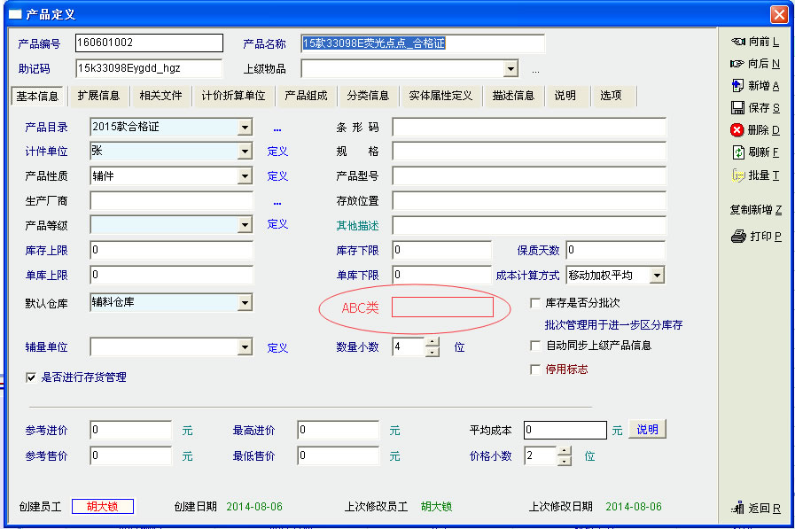 你直接在产品资料中间的分组管理里,加入A\B\C三个分组,分别拉进不同的物料,不就行了?