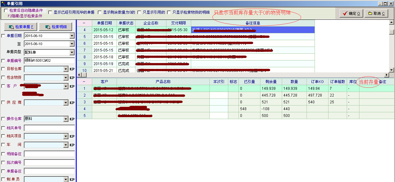 订单---配料---原料出库(车间加工) 当然在配料单界面是可以很清晰的看到库存量的, 但是在原料出库环节,引用配料单据的界面看不到库存,这样引用起来就有点费劲,需要同步打开配料单界面看库存。。。 如果引用单据的界面可以看到库存,引用单据就比较方便了。