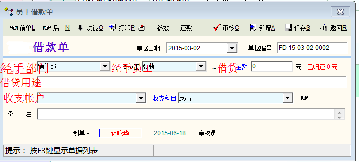 软件里的员工借款单使用有局限性,当向员工借款,借款金额应填负数,帐户金额才能增加,这样看着很别扭.借款单据的收支科目也不能辨别帐户的实际收支 建议改成通用的借款单形式: 当选择收支科目为收入时,帐户金额增加, 当选择收支科目为支出时,帐户金额减少 还款单也做相应的调整
