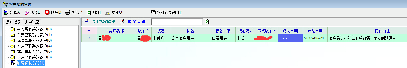如图,制订客户接触计划后再新增客户接触,客户接触计划提醒状态仍没有消除。按正常逻辑来说,某个客户有未完成的接触计划,系统提醒,但新增了接触计划,提醒状态应该消除才对。