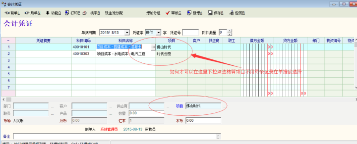 建议有项目核算、员工、客户/供应商等核算的会计科目,当点选到这些科目时,在明细表中下拉选择,不要在凭证底部,这样很不方便。