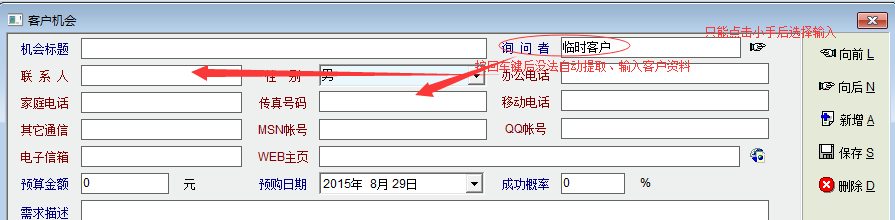 在客户机会编辑界面中,当输入的“询问者”(客户)是系统中的存档客户时,按回车键没法自动提取客户的资料,而是必须通过点击“询问者”右边的小手按钮后选择输入客户后才能提取该客户的资料。在其它的系统功能,如客户接触、客户管理、销售单等等中一般是输入存档客户名称或编码后回车就可以提取客户资料的。 没法通过按“回车键”自动提取客户资料,会导致脚本中的gui_trigger_change函数无法触发,没法配合change_to_win传递客户名称或客户编码到客户机会编辑窗口中。