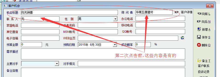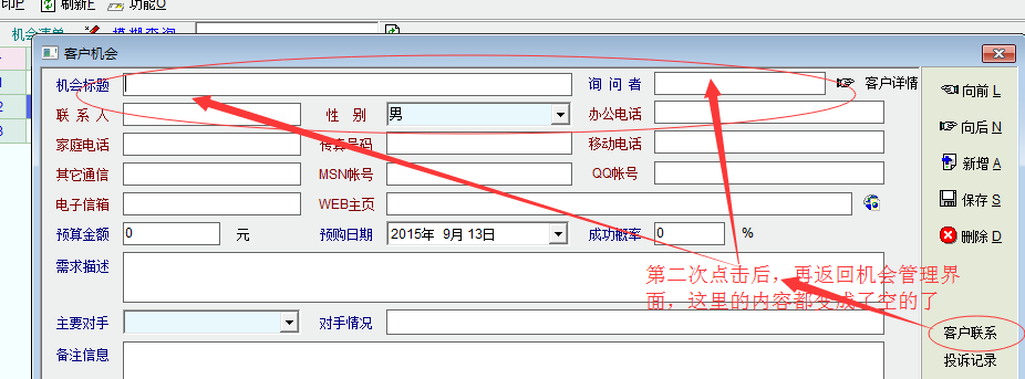 在商业机会中运行如下脚本: int func_show_win() { //run_csp_line,表示点击的时候执行这句脚本 string begin_date; gui_create_speedbutton("Panel_Func","客户联系",15,230,60,20,"客户联系","call_csp.rec.crm_chance.main1"); gui_create_speedbutton("Panel_Func","投诉记录",15,255,60,20,"投诉记录","call_csp.rec.crm_chance.main2"); ...... int main1() { string khm,khid,sql; khm=gui_get_val("Edit_Eba_Name");//获取客户名 sql="select eba_id from eba where eba_name = '"+khm+"'";//通过客户查询客户编码 db_run(sql); //通过客户查询客户编码 khid=db_res(0);//将查询结果(0表示查询到的第一个字段)赋值给khid. call_dll_func("crm_app","Crm_Gui_Touch_Adm"); change_to_win("客户接触管理==TForm_Touch_Adm"); gui_trigger_click("SpeedButton_Create"); gui_set_val("ComboBox_Ext_Eba_Id",khid); gui_trigger_change("ComboBox_Ext_Eba_Id"); return 1; }; int main2() { string khm,khid,sql; khm=gui_get_val("Edit_Eba_Name");//获取客户名 sql="select eba_id from eba where eba_name = '"+khm+"'";//通过客户查询客户编码 db_run(sql); //通过客户查询客户编码 khid=db_res(0);//将查询结果(0表示查询到的第一个字段)赋值给khid. call_dll_func("crm_app","Crm_Gui_Event_Adm"); change_to_win("客户事件-投诉建议管理==TForm_Event_Adm"); gui_trigger_click("SpeedButton_Create"); gui_set_val("ComboBox_Ext_Eba_Id",khid); gui_trigger_change("ComboBox_Ext_Eba_Id"); return 1; }; 脚本运行后,第一次点击客户联系或投诉记录,可以正确的新建客户联系或投诉记录。但如果再次点击创建的“客户联系”或“投诉记录” 按钮,运行脚本后,就没法新建“客户联系”记录或“投诉记录”了。 |