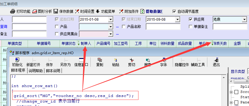 外协加工单明细没法用脚本改变明细字段的排序,系统一打开就默认按照制单人及保质天数排序,脚本排序失效了。运行脚本后,还是按照制单人及保质天数排序。
