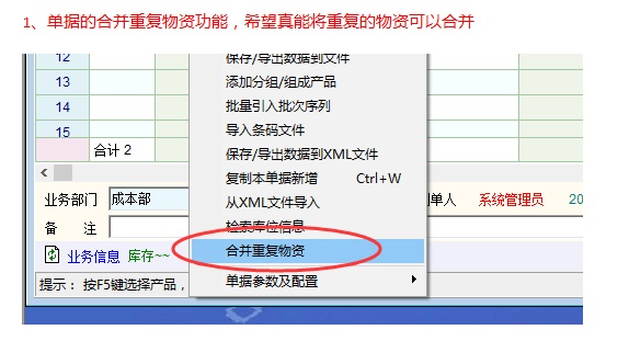 建议单据的合并重复物资功能真能有用,既然有这个功能就可以使用,如果为了保持可以追踪的可以不用这个功能,选择合并打印。如果不同部门经常开出申购单,申购单中有部分申购物品相同,在最后采购收货单也不能合并是很不方便的。至于跟踪追查,追查引用单号就可以了。