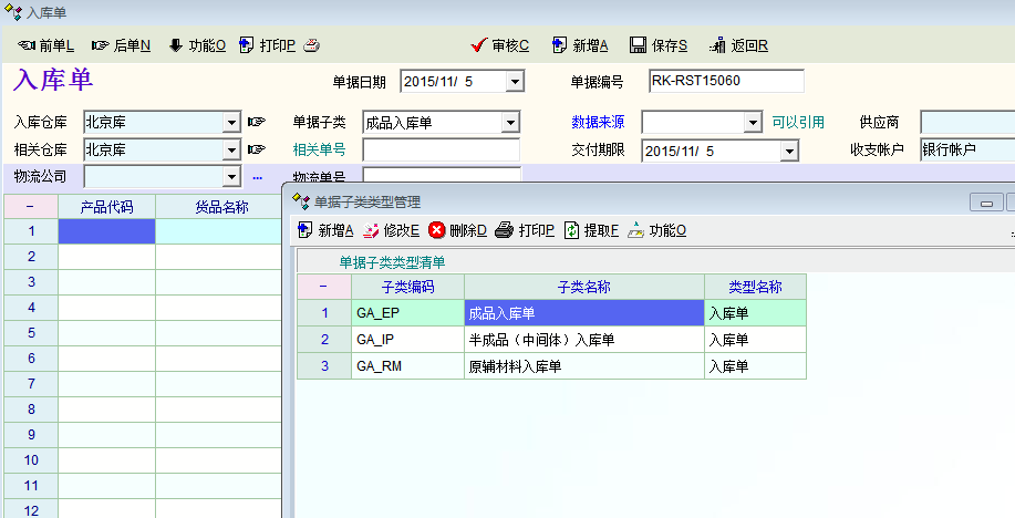 目前收款和付款单里的单据子类不支持输入,所以没有相关的选项,内容也是空的。