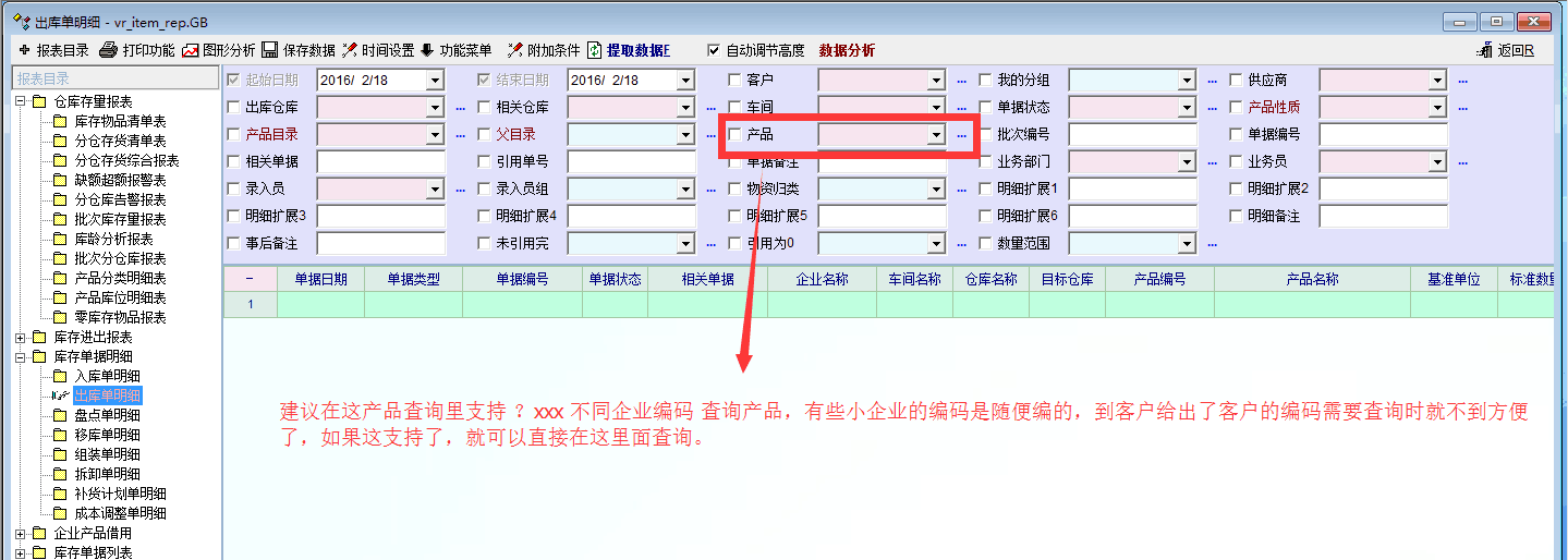 建议添加支持按不同企业对应编码查询。 保留之前版本的产品查询,方便企业用编号模糊查询如编号包含‘6937’的所有产品,用附加条件是可以实现,但不是很方便。 望老师参考,谢谢!