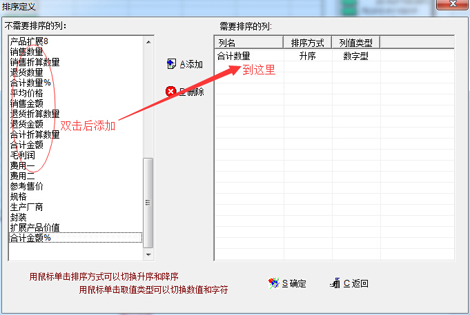 »报表图形数据分析中的排序选择中通过“双击添加排序项目”功能