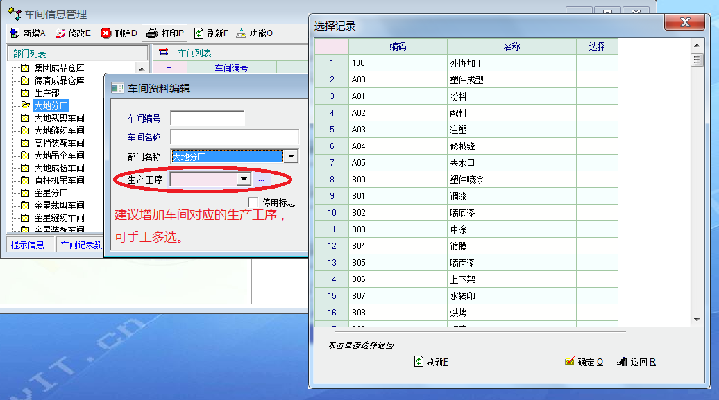 车间资料里建议增加对应的工序,允许多选,字段内容可以保存为: “工序编号1,工序编号2,..." 样式。 也可以考虑多选后用文本框显示,以适应车间的一些特殊情况。 有了车间对应的工序,再配合脚本,在分配生产任务时可以自动完成很多事情。