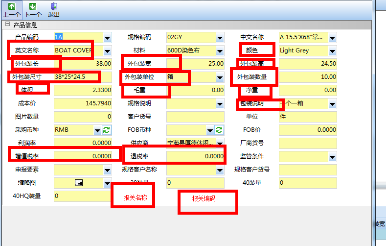 老师,我们是贸易企业,涉及到出口报关,报关数据中对外包装的体积、毛利、报关名称之类的数据很重要的,而且会被出货明细调用,现在的产品信息字段不够用的,即使扩展了现有的8个也不够用,而且这些字段工厂也会用的到,如果这些工厂跟外贸公司在合作 ,外贸公司会要求工厂提供这些数据的,详细如附件中图所示(红框内),这个目前我们公司在着手编产品资料了,我们是打算表格导入的方式去追加初始产品信息,希望能在6.20前实现这些功能,拜托了。