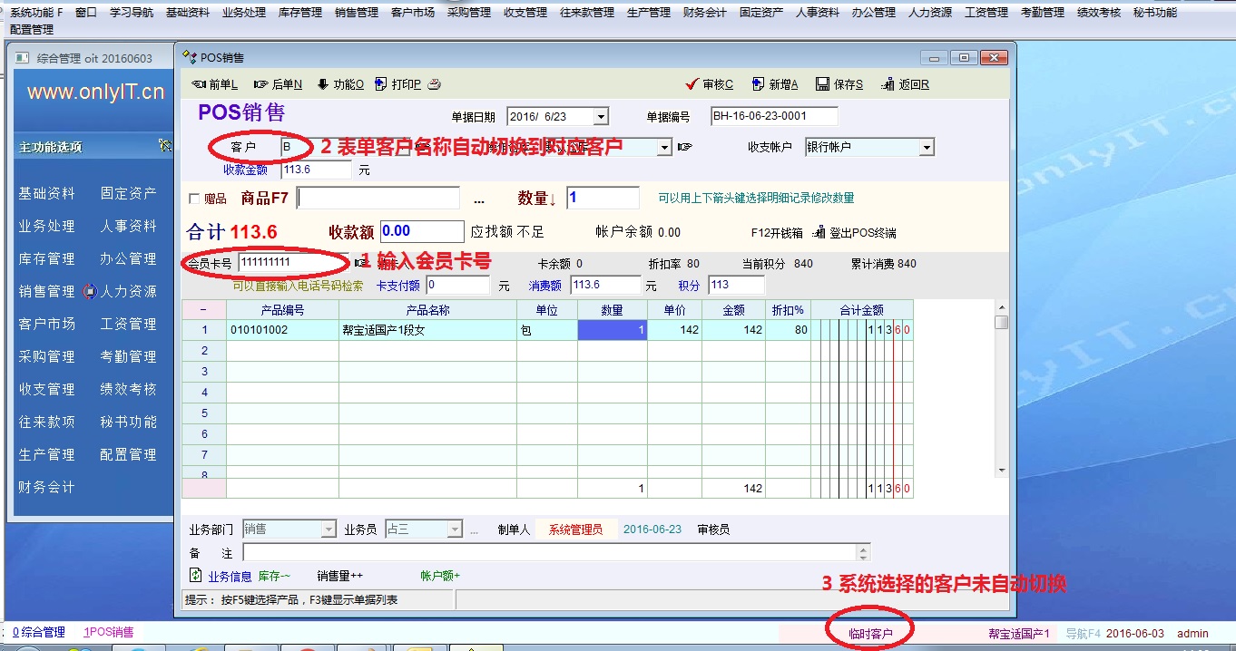 @qf2016 客户B对应会员卡号111111,对应价格体系普通零售价。“临时客户”无会员卡,对应价格体系批发价。 前面先做了一张“临时客户”的单据。 然后再做客户B的单据。输入会员卡号111111后,单据上的客户名已经自动切换到客户B。在单据中输入商品,但是引用的价格体系却为批发价。检查当时系统所选择的客户(图中标注3的位置),其实当时系统所选中的客户仍为“临时客户”,此时需要在客户栏重新回车确认一下,系统的选择才会改到客户B。 回车确认的时候,如果该客户有多张会员卡,那么“会员卡号”处又会自动切换到客户的第一张会员卡。 这个Bug是一个硬伤,打单的时候非常容易就给客户一个错误的价格。