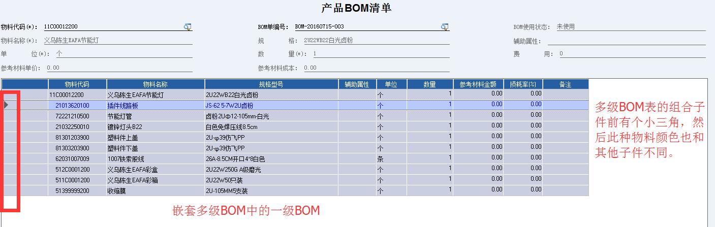 1 最细BOM不能引用中间环节的半成品,只能对生产领料和成品入仓管控,因为缺少中间半成品的编号,这张BOM表无法让中间环节的半成品引用出入仓。嵌套多级BOM很好的解决了这个问题。少了中间环节,对成本核算也是有一定影响的。