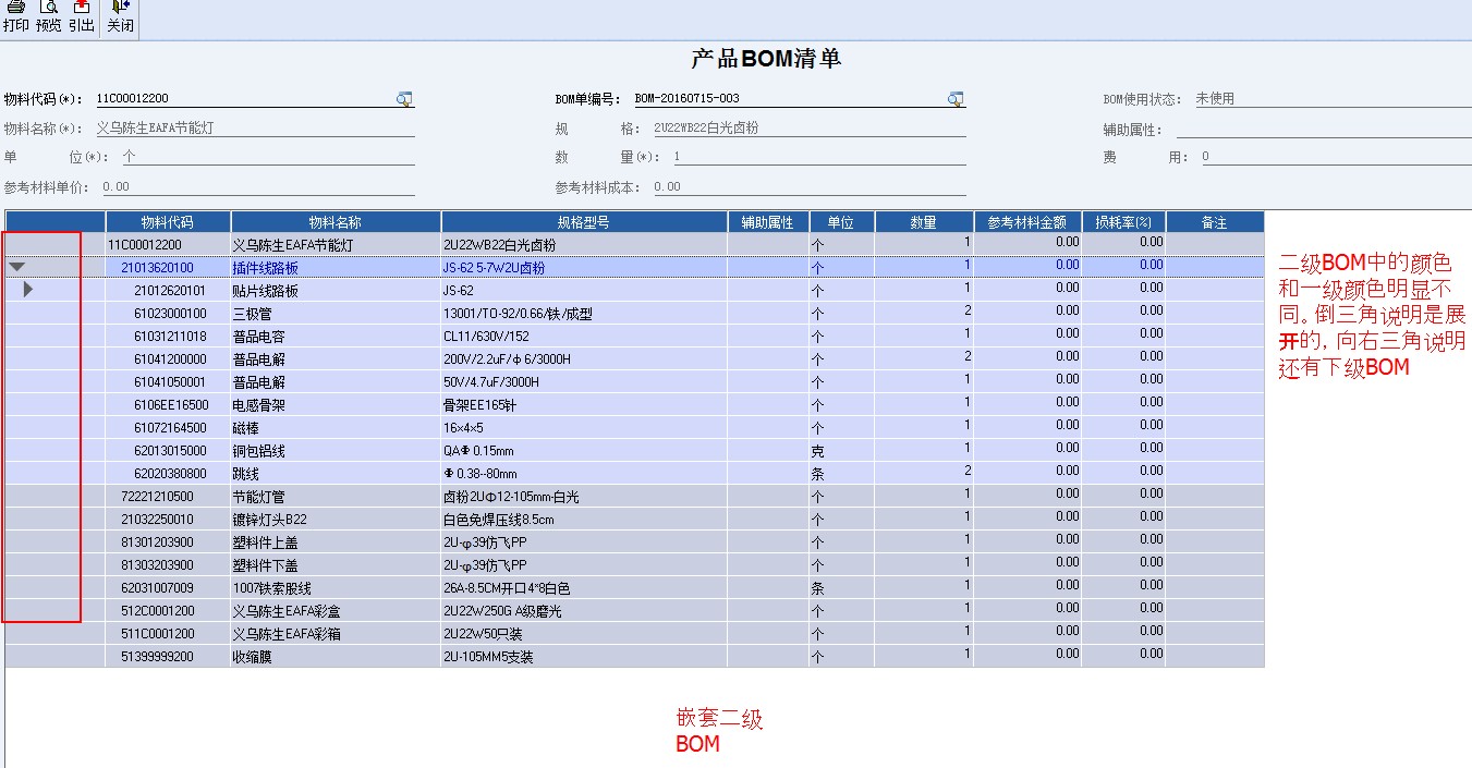 比较强大的多级嵌套BOM是这样的。