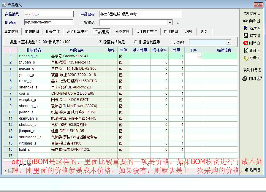 要注意的是BOM组成物料(明细物资)的单价组成。
