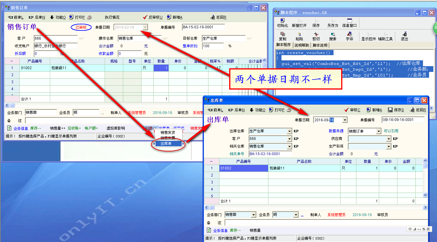 出库单由销售订单生成,如何编写脚本使 出库单的单据日期等于销售订单的日期 int create_voucher() { gui_set_val('ComboBox_Ext_Edt_Id','11'); //出库仓库 gui_set_val('ComboBox_Ext_Dept_Id','1'); //业务部: gui_set_val('ComboBox_Ext_Emp_Id','101'); //业务员 return 1; }; |