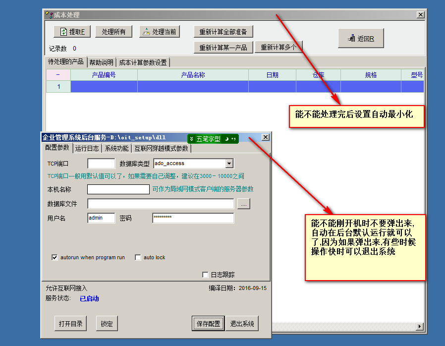 成本处理问题 1,因是服务端,不想每次都让他弹出来.处理完在一定的时间内自动最小化不是更好么?为什么还要让它停在桌面呢?? 问题2, 是因为如果服务器重启的时候,自动启动oserver.exe时,如果手脚快一点的话.就算是锁住了,也可以让oserver.exe停住下来.后以才想让oserver.exe开机时在后台默认启动就好了!如果需要时手动 打开不是更好.手动打开是要权限的!