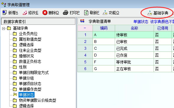 单据状态的显示文字更改在“基础字典”中改