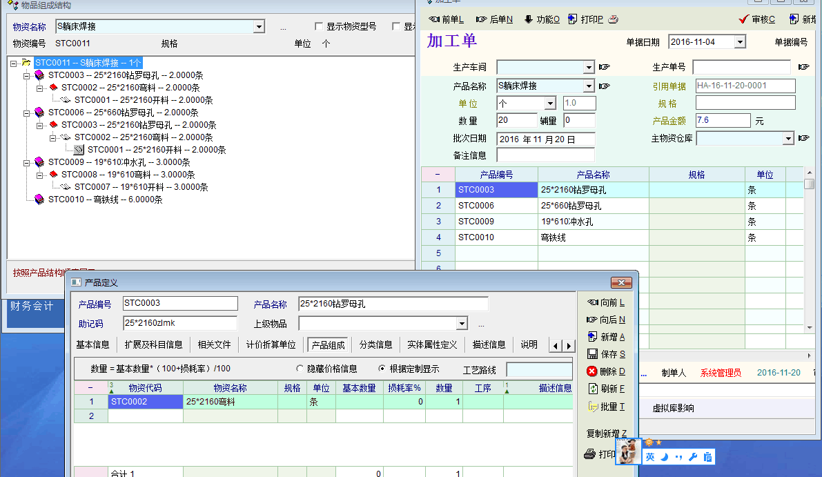 A经过A1 A2 A3工序成半成品 B经过B1 B2 B3工序成半成品 A B 只是形变 并未增加或者减少 产品1有2个A ,1个B 组成 因为是计件核算工资 所以我把每种工序做成一样产品 这样能看到各工序每天完成情况也能方便核算工资 系统带的工序功能一直没弄懂 如果能方便核算工资的话就不用添加那么多产品信息了 如有便捷方式的请指导 产品定义里 A3由A2组成 A2由A1组成 B2由B2组成 B2由B1组成 产品1有 2A和1B组成 查询 物品组成结构 无问题 新建 计划生产单 生产产品1 20套 审核 生产单 F6 引用 生产计划单 只带出 2A 和 1B 这是为什么? A 和 B 的明细没有带出(看图) 之前发过帖子可能写的不是很详细 所以这次具体一些 望能得到各位老师的指导和帮助 想要达到的目标 接到订单 新建生产计划单 审核 加工 新建加工单 选择加工 物品1 50 能带出物品1所需要的所有明细资料(组件和加工组件的工序 现在未能实现) 入库 入库单 每天录入成品入库 出库 出库单 录入每次成品出库单 入库这里需要能计算计件工资 举个例子 入库 100个A1 100个A2 100个A3 50个B1 50个B2 50个B3 100个A 50个B 50个产品1 实际仓库只有50个产品1 但每个产品(工序)都需要核算计件工资 9个员工 能否查询实时工资 单据引用流程已懂 库存每日报表已懂 工资核算环节 系统自带的工资管理块求指导啊 完全没弄懂怎么引用生产 或者入库环节来核算工资 生产 入库单据里没有能选择员工的选项 有个业务员选项 但不知道在哪能找到单独查询 和月底汇总的 工资明细表来 求指导啊