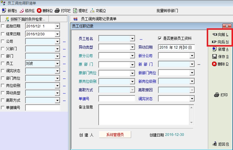 如题,调岗调职记录,卡片“向前、向后”单击后,显示的记录与“列表不符”,且会停留在某人的记录,功能失效。 具体如图: