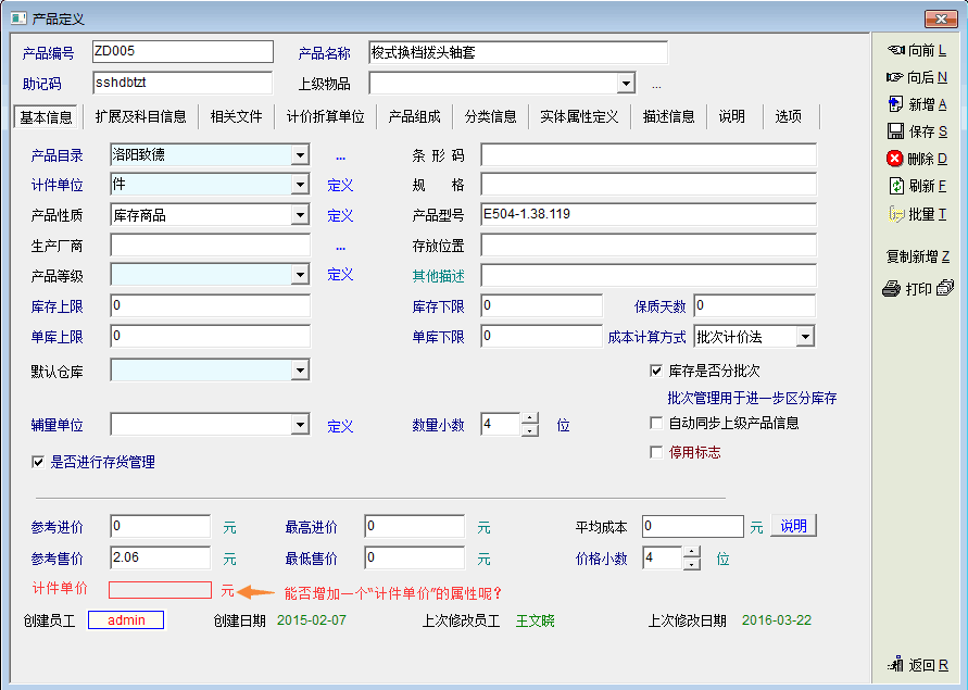 进销存软件在计算计件工资的时候需要重新建立一套计件产品资料,暂时还不能与系统中的产品资料共享,作为变通方法,希望用进销存单据自定义一个计件工资单,使用系统中的产品资料,但是系统中产品资料没有计件单价属性,只有参考进价、参考售价、平均进价等信息,如果能够增加一项“计件单价",这样就可以用进销存单据来做计件工资了,希望老师可以在今后的版本中增加这一属性,如果同时能否计件产品与系统中的产品资料同步就更好了。