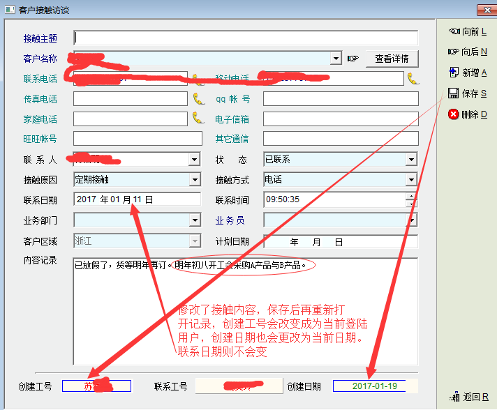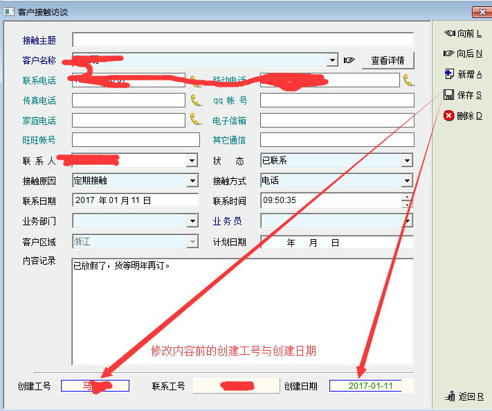 客户接触记录中修改内容保存后重新打开,创建工号与创建日期会发生更改。如图片所示。