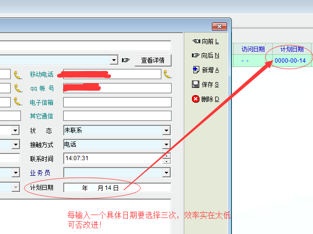如图,客户接触中的日期输入效率太低。建议老师改进一下。或者像系统中其它地方的常用的日期输入模式也好。