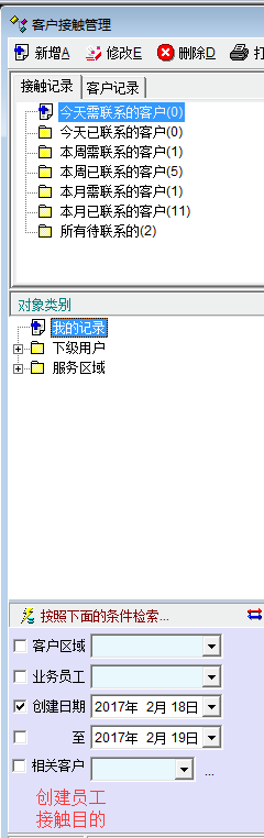 客户接触记录功能已经在逐步使用中,有些细节还是希望能完善。希望客户接触记录列表能增加按“创建员工”,“接触目的”检索条件。