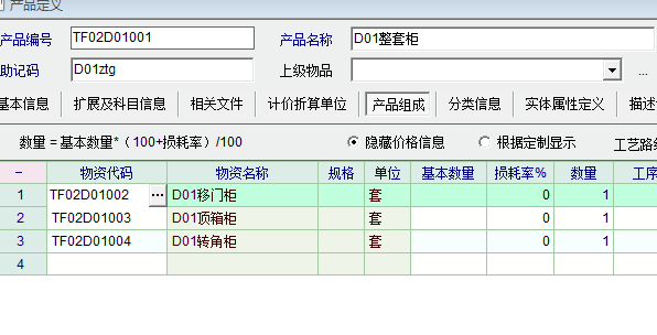 1.在产品组成里定义了下级产品,也录入了下级产品数量,整套由(移门柜+转角柜+顶箱柜),所以只录入下级数量。 2.这里的整套由下级的几个部件组成移门柜+转角柜+顶箱柜,销售出库时按整套出,查看库存清单时为什么显示库存为负