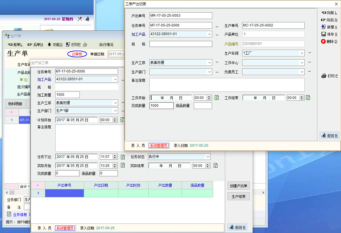 生产派工单中: 1)应有个防错机制。未创建产出单,不能生产结束;未创建产出单,确认生产接受后无法修改。 2)工序产出记录中,工作开始日期不能自动引用生产派工单中的实际开始 工作结束日期最好能自动引用当前日期和时间。 3)产品有多个子产品组成,子产品又有自己的工艺流程,生产单工序任务不自动计算包含子产品工序,领料表也不包含