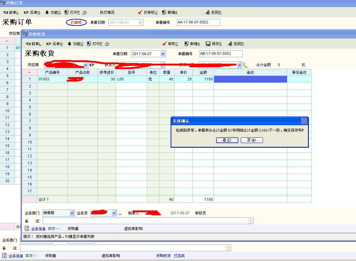 以前也出现好几次 最新版本20170521 最近又出现了 采购订单直接创建采购收货出现 表头合计金额和明细金额不一致,(图二)这个情况,以前出现过几次销售订单直接创建销售发货单 金额不一致的情况(图一),不知道是什么原因呢