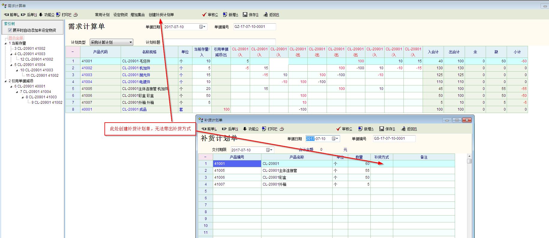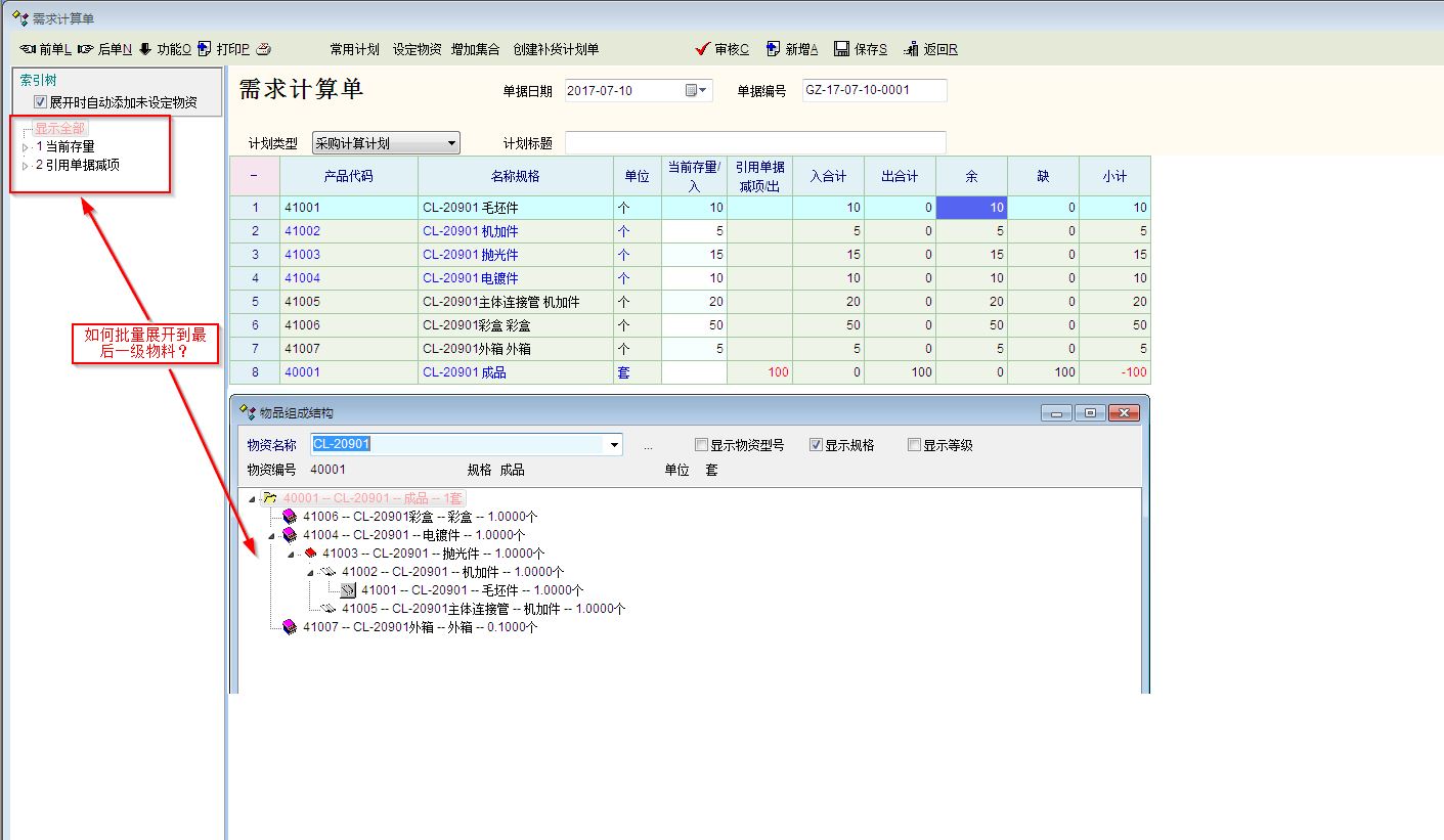 需求分析功能我试过,但是能展开BOM进行计算。 对于单纯计算没有物料组成的物料,需求分析功能考虑的很全面。对于有物料组成的物料进行需求计算,就无法满足需求。 例如我上面例子,客户下了CL-20901产品100套,需求分析单,只能算出需求补100套产品,需不能计算出要补多少原材料和配件。